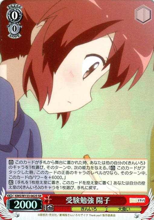 【起】[手札を1枚控え室に置き、このカードを控え室に置く] あなたは自分の控え室の《きんいろ》のキャラを1枚選び、手札に戻す。