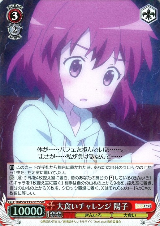 【起】[(5) 手札を4枚控え室に置き、他のあなたの舞台の【スタンド】している《きんいろ》のキャラを1枚控え室に置く] 相手は自分の山札の上から9枚を、控え室に置き、自分の山札の上からX枚を、クロック置場に置く。XはそれらのカードのCXの枚数に等しい。