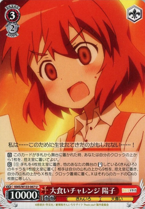 【起】[(5) 手札を4枚控え室に置き、他のあなたの舞台の【スタンド】している《きんいろ》のキャラを1枚控え室に置く] 相手は自分の山札の上から9枚を、控え室に置き、自分の山札の上からX枚を、クロック置場に置く。XはそれらのカードのCXの枚数に等しい。