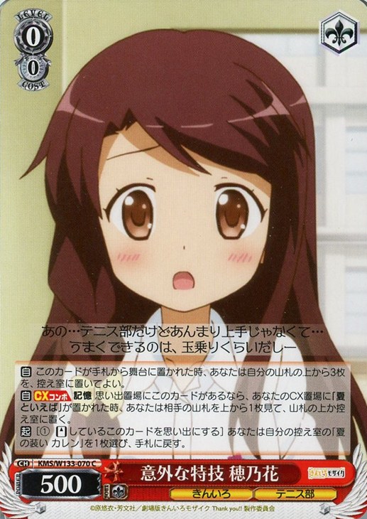 【自】【CXコンボ】 記憶 思い出置場にこのカードがあるなら、あなたのCX置場に「夏といえば」が置かれた時、あなたは相手の山札を上から1枚見て、山札の上か控え室に置く。