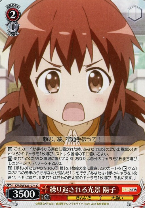 【起】[手札の「たおやかな女の子 綾」を1枚控え室に置き、このカードを【レスト】する] 次の2つの効果のうちあなたが選んだ1つを行う。『あなたは相手のキャラを1枚選び、手札に戻す。』『あなたは自分の控え室のキャラを1枚選び、手札に戻す。』
