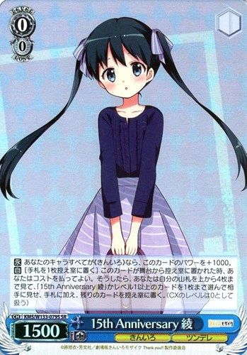 【自】[手札を1枚控え室に置く] このカードが舞台から控え室に置かれた時、あなたはコストを払ってよい。そうしたら、あなたは自分の山札を上から4枚まで見て、「15th Anniversary 綾」かレベル1以上のカードを1枚まで選んで相手に見せ、手札に加え、残りのカードを控え室に置く。(CXのレベルは0として扱う)