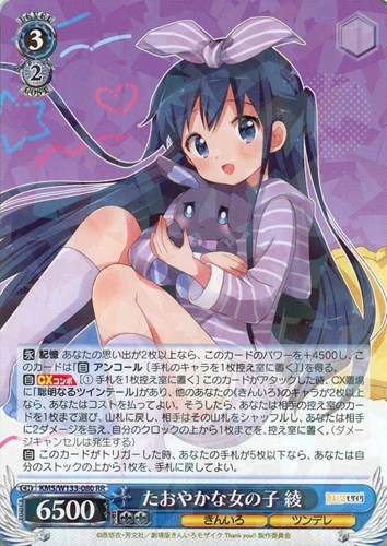 【自】【CXコンボ】[(1) 手札を1枚控え室に置く] このカードがアタックした時、CX置場に「聡明なるツインテール」があり、他のあなたの《きんいろ》のキャラが2枚以上なら、あなたはコストを払ってよい。そうしたら、あなたは相手の控え室のカードを1枚まで選び、山札に戻し、相手はその山札をシャッフルし、あなたは相手に2ダメージを与え、自分のクロックの上から1枚までを、控え室に置く。(ダメージキャンセルは発生する)