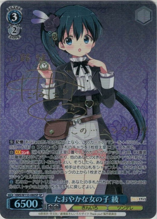 【自】【CXコンボ】[(1) 手札を1枚控え室に置く] このカードがアタックした時、CX置場に「聡明なるツインテール」があり、他のあなたの《きんいろ》のキャラが2枚以上なら、あなたはコストを払ってよい。そうしたら、あなたは相手の控え室のカードを1枚まで選び、山札に戻し、相手はその山札をシャッフルし、あなたは相手に2ダメージを与え、自分のクロックの上から1枚までを、控え室に置く。(ダメージキャンセルは発生する)