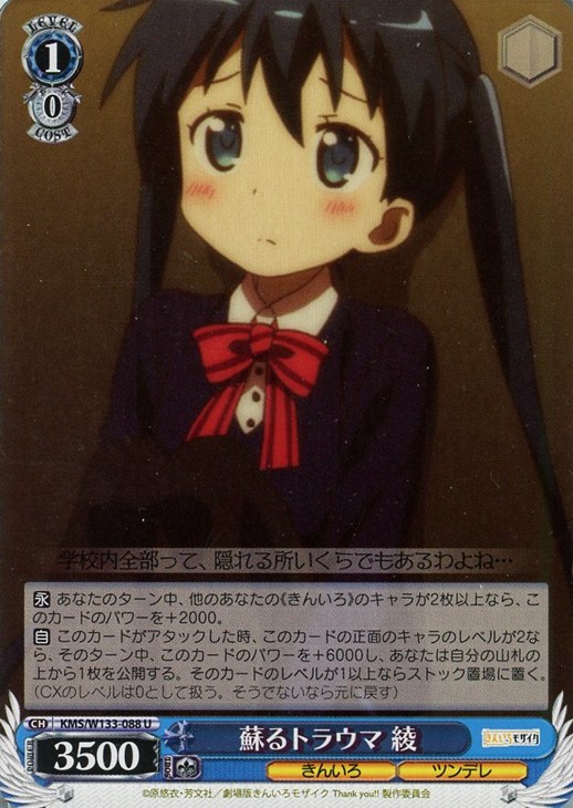 【自】 このカードがアタックした時、このカードの正面のキャラのレベルが2なら、そのターン中、このカードのパワーを+6000し、あなたは自分の山札の上から1枚を公開する。そのカードのレベルが1以上ならストック置場に置く。(CXのレベルは0として扱う。そうでないなら元に戻す)
