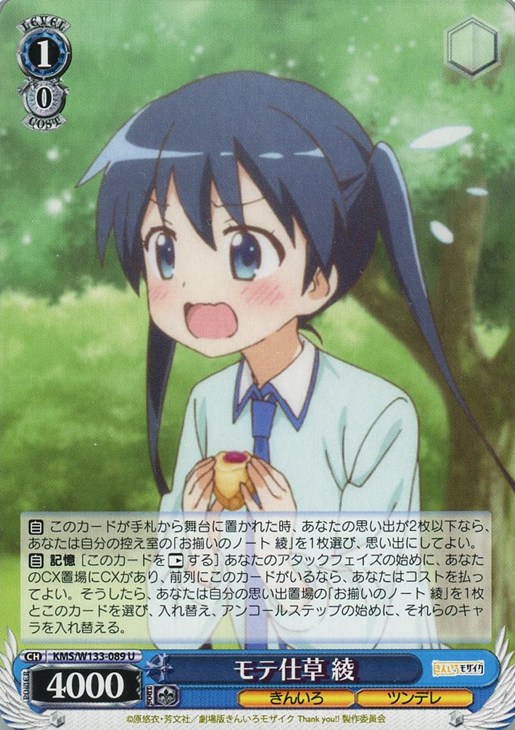 【自】 記憶 [このカードを【レスト】する] あなたのアタックフェイズの始めに、あなたのCX置場にCXがあり、前列にこのカードがいるなら、あなたはコストを払ってよい。そうしたら、あなたは自分の思い出置場の「お揃いのノート 綾」を1枚とこのカードを選び、入れ替え、アンコールステップの始めに、それらのキャラを入れ替える。