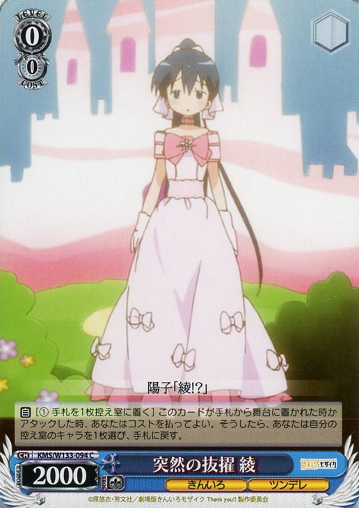 【自】[(1) 手札を1枚控え室に置く] このカードが手札から舞台に置かれた時かアタックした時、あなたはコストを払ってよい。そうしたら、あなたは自分の控え室のキャラを1枚選び、手札に戻す。