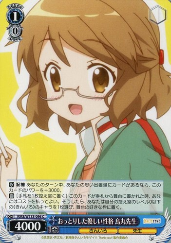 【自】[手札を1枚控え室に置く] このカードが手札から舞台に置かれた時、あなたはコストを払ってよい。そうしたら、あなたは自分の控え室のレベル0以下の《きんいろ》のキャラを1枚選び、舞台の好きな枠に置く。