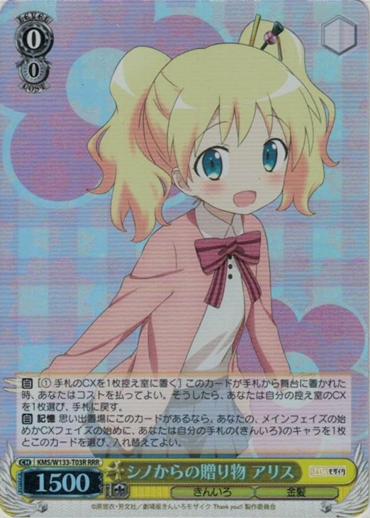 【自】 記憶 思い出置場にこのカードがあるなら、あなたの、メインフェイズの始めかCXフェイズの始めに、あなたは自分の手札の《きんいろ》のキャラを1枚とこのカードを選び、入れ替えてよい。