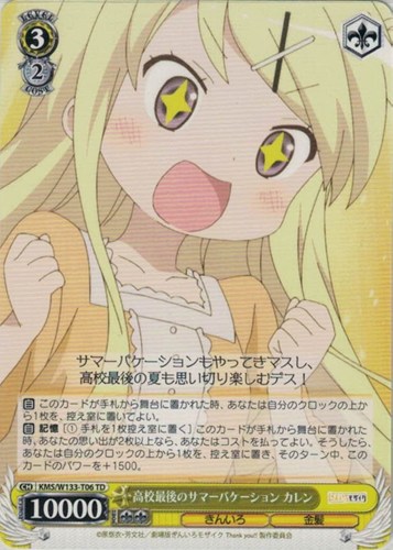 【自】 記憶 [(1) 手札を1枚控え室に置く] このカードが手札から舞台に置かれた時、あなたの思い出が2枚以上なら、あなたはコストを払ってよい。そうしたら、あなたは自分のクロックの上から1枚を、控え室に置き、そのターン中、このカードのパワーを+1500。