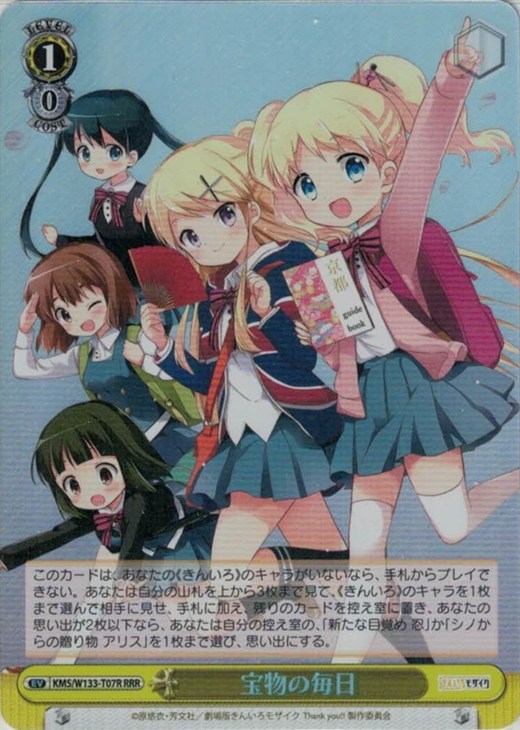- このカードは、あなたの《きんいろ》のキャラがいないなら、手札からプレイできない。あなたは自分の山札を上から3枚まで見て、《きんいろ》のキャラを1枚まで選んで相手に見せ、手札に加え、残りのカードを控え室に置き、あなたの思い出が2枚以下なら、あなたは自分の控え室の、「新たな目覚め 忍」か「シノからの贈り物 アリス」を1枚まで選び、思い出にする。