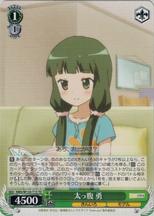 【永】 あなたのターン中、他のあなたの《きんいろ》のキャラが2枚以上なら、このカードのパワーを+3500し、このカードは次の2つの能力を得る。『【自】 このカードがアタックした時、このカードの正面のキャラのコストが2以上なら、そのターン中、このカードのパワーを+4000。』『【自】 このカードのバトル相手が【リバース】した時、あなたは相手のクロックの上から1枚を、控え室に置いてよい。そうしたら、あなたはそのキャラをクロック置場に置く。』