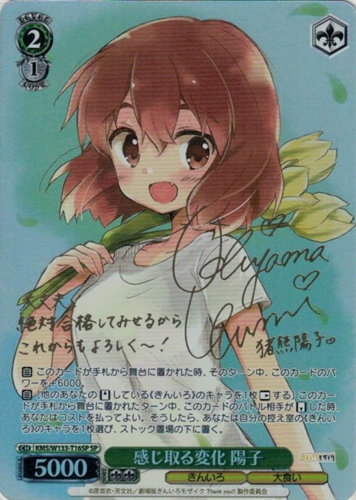 【自】[他のあなたの【スタンド】している《きんいろ》のキャラを1枚【レスト】する] このカードが手札から舞台に置かれたターン中、このカードのバトル相手が【リバース】した時、あなたはコストを払ってよい。そうしたら、あなたは自分の控え室の《きんいろ》のキャラを1枚選び、ストック置場の下に置く。