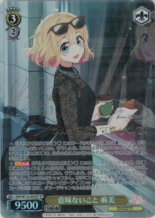 【自】【CXコンボ】[手札を1枚控え室に置く] このカードがアタックした時、CX置場に「ちょっと可笑しい」があり、他のあなたの《かのかり》のキャラがいるなら、あなたはコストを払ってよい。そうしたら、あなたは自分の山札の上から8枚を公開し、その山札をシャッフルし、相手にXダメージを与える。Xはこの効果で公開されたカードのトリガーアイコンのリターンの合計に等しい。(公開したカードは元に戻す。ダメージキャンセルは発生する)