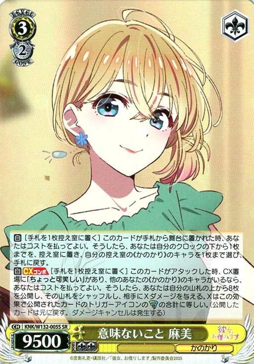 【自】【CXコンボ】[手札を1枚控え室に置く] このカードがアタックした時、CX置場に「ちょっと可笑しい」があり、他のあなたの《かのかり》のキャラがいるなら、あなたはコストを払ってよい。そうしたら、あなたは自分の山札の上から8枚を公開し、その山札をシャッフルし、相手にXダメージを与える。Xはこの効果で公開されたカードのトリガーアイコンのリターンの合計に等しい。(公開したカードは元に戻す。ダメージキャンセルは発生する)