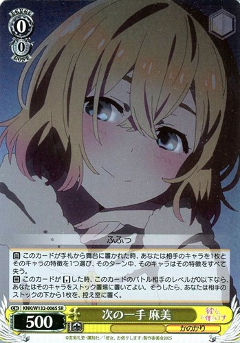 【自】 このカードが手札から舞台に置かれた時、あなたは相手のキャラを1枚とそのキャラの特徴を1つ選び、そのターン中、そのキャラはその特徴をすべて失う。