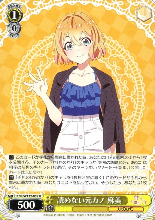 【自】[手札の《かのかり》のキャラを1枚控え室に置く] このカードが手札から舞台に置かれた時、あなたはコストを払ってよい。そうしたら、あなたは1枚引く。