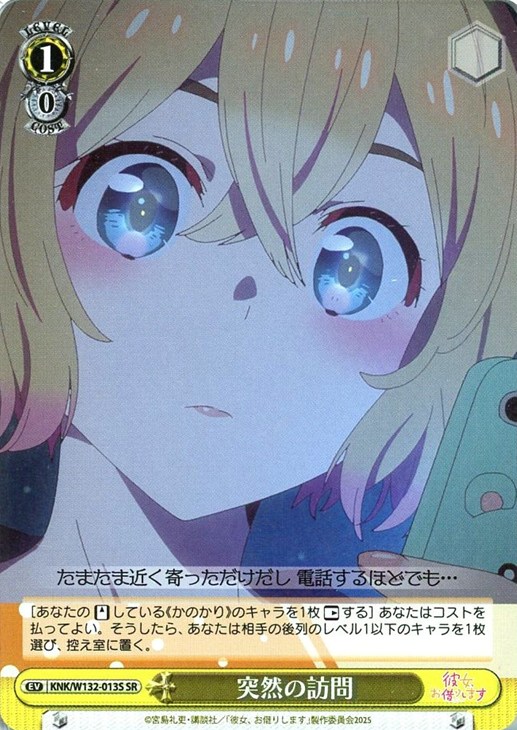 - [あなたの【スタンド】している《かのかり》のキャラを1枚【レスト】する] あなたはコストを払ってよい。そうしたら、あなたは相手の後列のレベル1以下のキャラを1枚選び、控え室に置く。