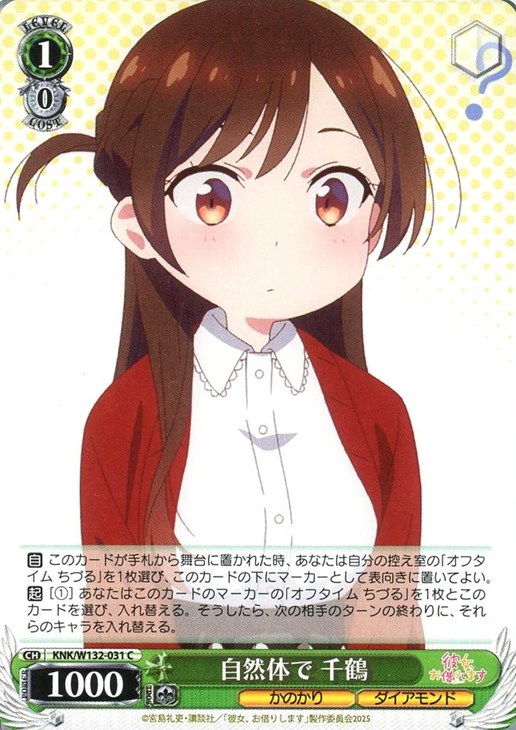 【自】 このカードが手札から舞台に置かれた時、あなたは自分の控え室の「オフタイム ちづる」を1枚選び、このカードの下にマーカーとして表向きに置いてよい。