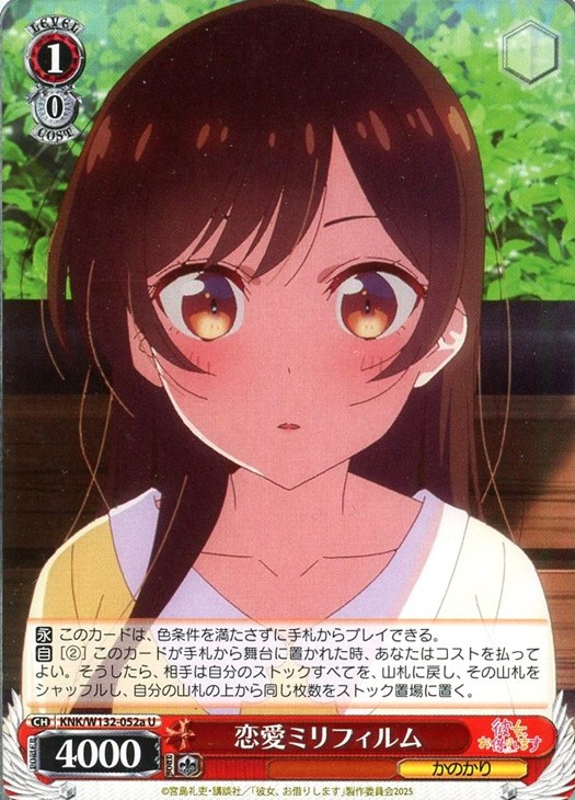 【自】[(2)] このカードが手札から舞台に置かれた時、あなたはコストを払ってよい。そうしたら、相手は自分のストックすべてを、山札に戻し、その山札をシャッフルし、自分の山札の上から同じ枚数をストック置場に置く。