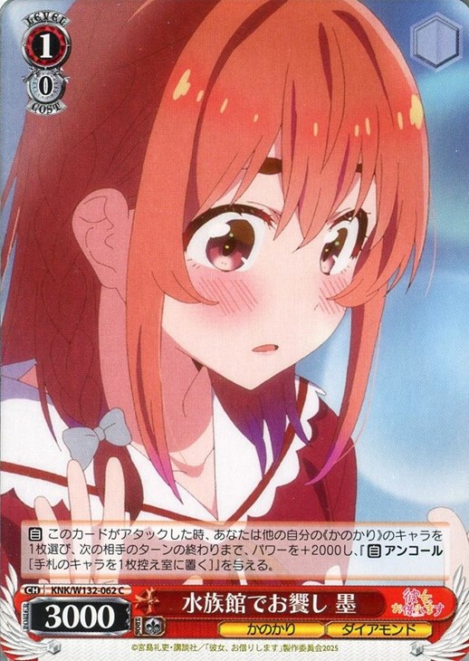 - 【自】 このカードがアタックした時、あなたは他の自分の《かのかり》のキャラを1枚選び、次の相手のターンの終わりまで、パワーを+2000し、『【自】 アンコール [手札のキャラを1枚控え室に置く]』を与える。