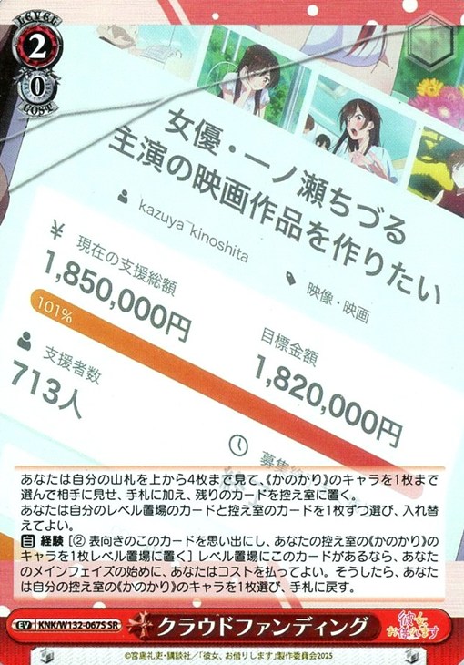 【自】 経験 [(2) 表向きのこのカードを思い出にし、あなたの控え室の《かのかり》のキャラを1枚レベル置場に置く] レベル置場にこのカードがあるなら、あなたのメインフェイズの始めに、あなたはコストを払ってよい。そうしたら、あなたは自分の控え室の《かのかり》のキャラを1枚選び、手札に戻す。