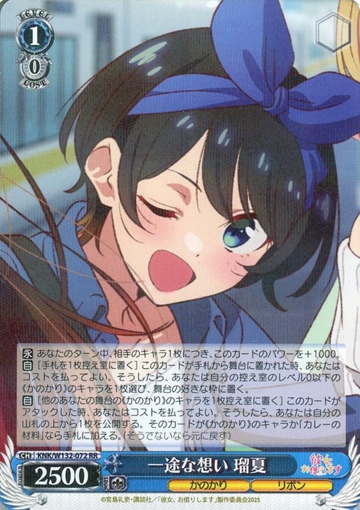 【自】[他のあなたの舞台の《かのかり》のキャラを1枚控え室に置く] このカードがアタックした時、あなたはコストを払ってよい。そうしたら、あなたは自分の山札の上から1枚を公開する。そのカードが《かのかり》のキャラか「カレーの材料」なら手札に加える。(そうでないなら元に戻す)