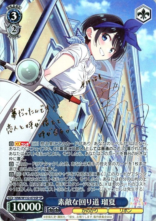 【自】[(2) 手札の《かのかり》のキャラを1枚控え室に置く] このカードがアタックした時、あなたはコストを払ってよい。そうしたら、あなたは自分の山札の上から1枚を、控え室に置き、相手にXダメージを与える。Xはそのカードのコスト+1に等しい。(CXのコストは0として扱う。ダメージキャンセルは発生する)