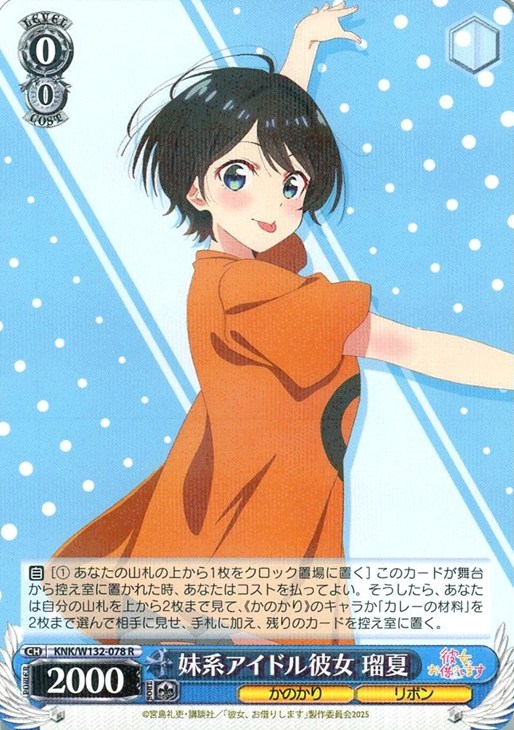 - 【自】[(1) あなたの山札の上から1枚をクロック置場に置く] このカードが舞台から控え室に置かれた時、あなたはコストを払ってよい。そうしたら、あなたは自分の山札を上から2枚まで見て、《かのかり》のキャラか「カレーの材料」を2枚まで選んで相手に見せ、手札に加え、残りのカードを控え室に置く。