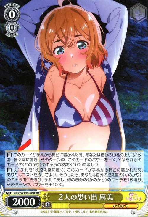 【自】[(1) 手札を1枚控え室に置く] このカードが手札から舞台に置かれた時、あなたはコストを払ってよい。そうしたら、あなたは自分の控え室の《かのかり》のキャラを1枚選び、手札に戻し、他の自分の《かのかり》のキャラを1枚選び、そのターン中、パワーを+1000。