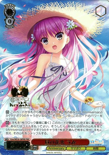 【自】[手札を1枚クロック置場に置く] このカードが舞台から控え室に置かれた時、あなたはコストを払ってよい。そうしたら、あなたは自分の山札を見て《Anniversary》か《サマポケ》のキャラを1枚まで選んで相手に見せ、手札に加え、その山札をシャッフルする。