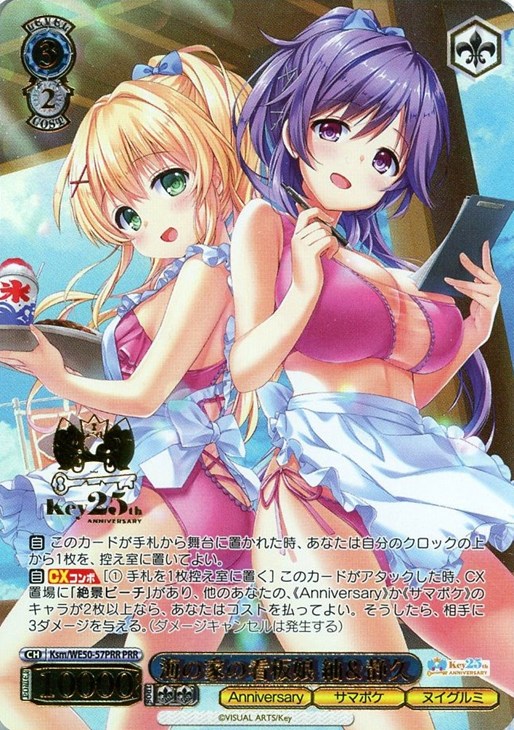 【自】 このカードが手札から舞台に置かれた時、あなたは自分のクロックの上から1枚を、控え室に置いてよい。 【自】【CXコンボ】[(1) 手札を1枚控え室に置く] このカードがアタックした時、CX置場に「絶景ビーチ」があり、他のあなたの、《Anniversary》か《サマポケ》のキャラが2枚以上なら、あなたはコストを払ってよい。そうしたら、相手に3ダメージを与える。(ダメージキャンセルは発生する)