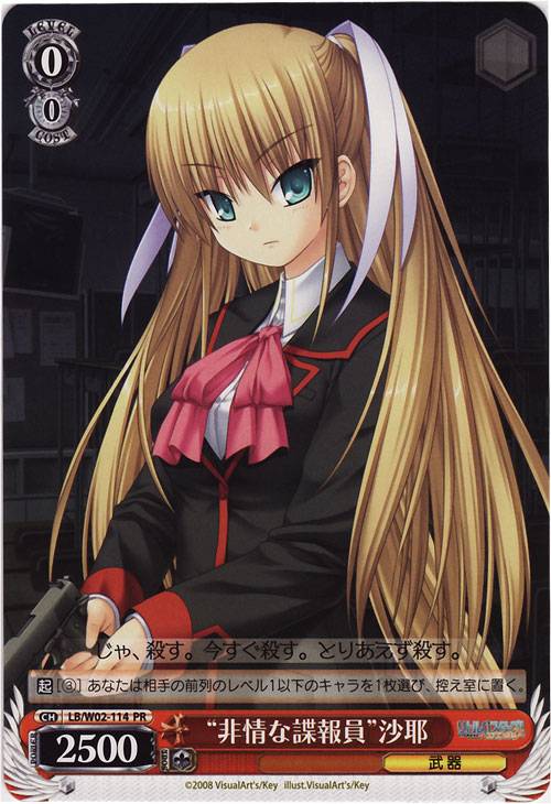 - 【起】[(3)] あなたは相手の前列のレベル1以下のキャラを1枚選び、控え室に置く。フレーバー:じゃ、殺す。 今すぐ殺す。 とりあえず殺す。