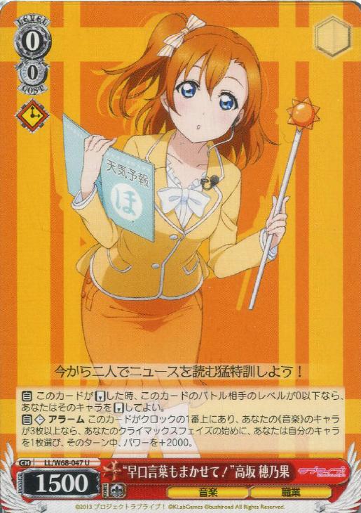 【自】【クロック】 アラーム このカードがクロックの1番上にあり、あなたの《音楽》のキャラが3枚以上なら、あなたのクライマックスフェイズの始めに、あなたは自分のキャラを1枚選び、そのターン中、パワーを+2000。