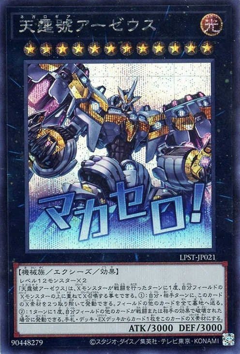 「天霆號アーゼウス」は、Xモンスターが戦闘を行ったターンに1度、自分フィールドのXモンスターの上に重ねてX召喚する事もできる。①:自分・相手ターンに、このカードのX素材を2つ取り除いて発動できる。フィールドの他のカードを全て墓地へ送る。②:1ターンに1度、自分フィールドの他のカードが戦闘または相手の効果で破壊された場合に発動できる。手札・デッキ・EXデッキからカード1枚を選び、このカードのX素材とする。