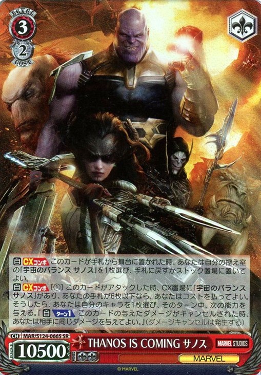 【自】【CXコンボ】[(1)] このカードがアタックした時、CX置場に「宇宙のバランス サノス」があり、あなたの手札が6枚以下なら、あなたはコストを払ってよい。そうしたら、あなたは自分のキャラを1枚選び、そのターン中、次の能力を与える。『【自】【ターン1】 このカードの与えたダメージがキャンセルされた時、あなたは相手に同じダメージを与えてよい。』(ダメージキャンセルは発生する)