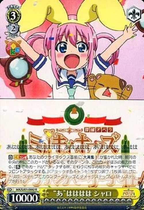 【自】【CXコンボ】 あなたのクライマックス置場に「大興奮!」が置かれた時、前列の中央の枠にこのカードがいるなら、そのターン中、このカードは次の能力を得る。『【永】 このカードがアタックする時、かわりに相手の前列のキャラすべてにフロントアタックする。』(アタックするキャラを1枚ずつ選び、1枚選ぶたびに、トリガーステップとカウンターステップとダメージステップとバトルステップを行う)