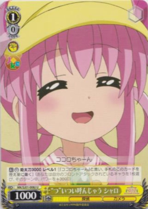 【起】【カウンター】 助太刀3000 レベル1 [『ココロちゃーん』と言い、手札のこのカードを控え室に置く] (あなたは自分のフロントアタックされているキャラを1枚選び、そのターン中、パワーを+3000)