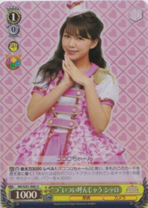 【起】【カウンター】 助太刀3000 レベル1 [『ココロちゃーん』と言い、手札のこのカードを控え室に置く] (あなたは自分のフロントアタックされているキャラを1枚選び、そのターン中、パワーを+3000)