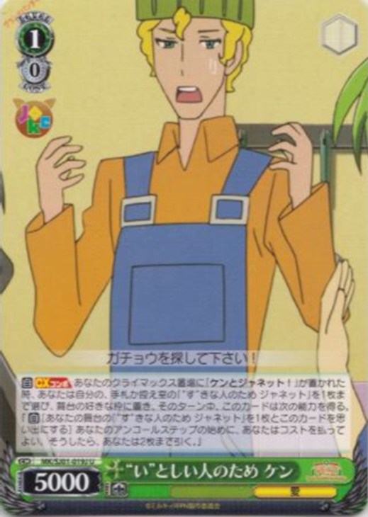 【自】【CXコンボ】 あなたのクライマックス置場に「ケンとジャネット!」が置かれた時、あなたは自分の、手札か控え室の「“す”きな人のため ジャネット」を1枚まで選び、舞台の好きな枠に置き、そのターン中、このカードは次の能力を得る。『【自】[あなたの舞台の「“す”きな人のため ジャネット」を1枚とこのカードを思い出にする] あなたのアンコールステップの始めに、あなたはコストを払ってよい。そうしたら、あなたは2枚まで引く。』