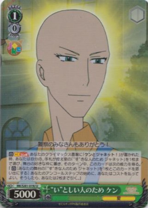 【自】【CXコンボ】 あなたのクライマックス置場に「ケンとジャネット!」が置かれた時、あなたは自分の、手札か控え室の「“す”きな人のため ジャネット」を1枚まで選び、舞台の好きな枠に置き、そのターン中、このカードは次の能力を得る。『【自】[あなたの舞台の「“す”きな人のため ジャネット」を1枚とこのカードを思い出にする] あなたのアンコールステップの始めに、あなたはコストを払ってよい。そうしたら、あなたは2枚まで引く。』