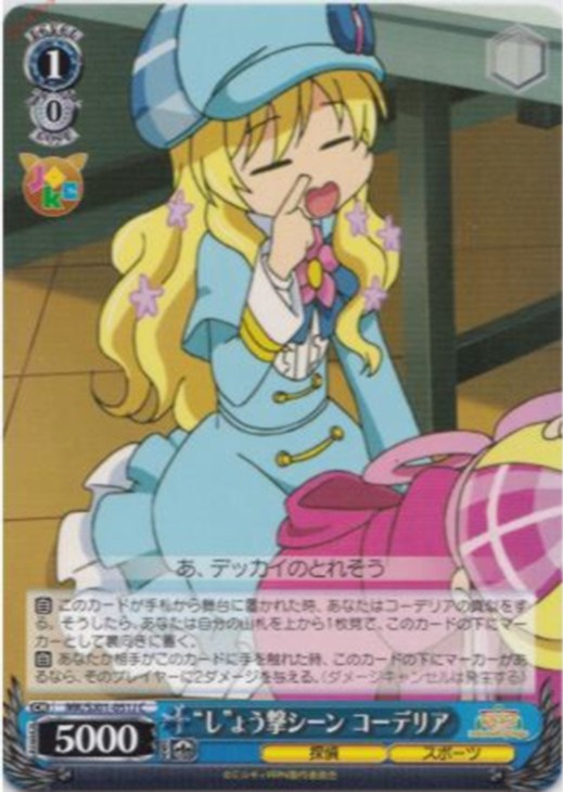 【自】 このカードが手札から舞台に置かれた時、あなたはコーデリアの真似をする。そうしたら、あなたは自分の山札を上から1枚見て、このカードの下にマーカーとして裏向きに置く。