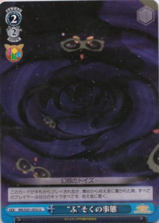 このカードが手札からプレイされるか、舞台から控え室に置かれた時、すべてのプレイヤーは自分のキャラすべてを、控え室に置く。