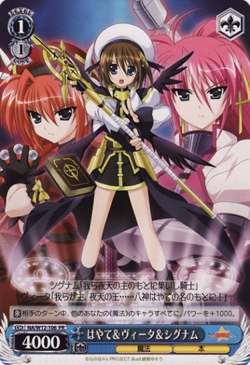 - 【永】 相手のターン中、他のあなたの《魔法》のキャラすべてに、パワーを+1000。フレーバー:シグナム「我ら夜天の主のもとに集いし騎士」ヴィータ「我らが主、夜天の王……八神はやての名のもとに!」イラスト:緋賀ゆかり