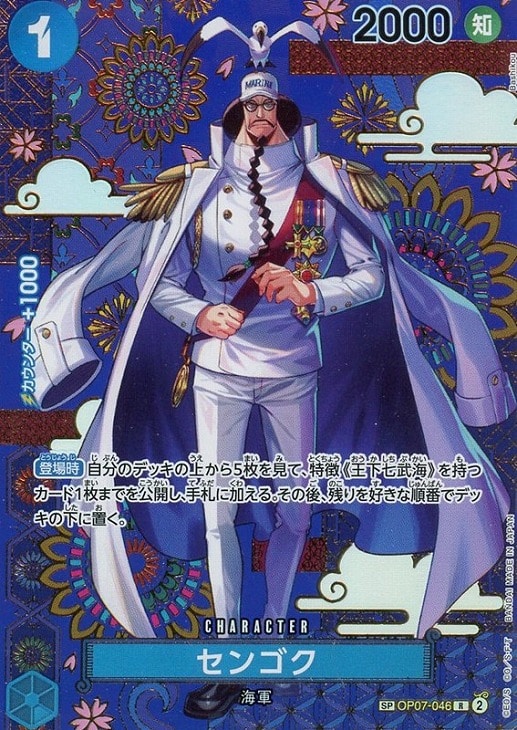 【登場時】自分のデッキの上から5枚を見て、特徴《王下七武海》を持つカード1枚までを公開し、手札に加える。その後、残りを好きな順番でデッキの下に置く。