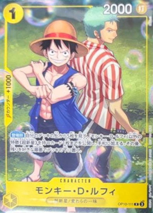 - 【登場時】自分のデッキの上から5枚を見て、「モンキー・D・ルフィ」以外の特徴《超新星》を持つカード1枚までを公開し、手札に加える。その後、残りを好きな順番でデッキの下に置く。