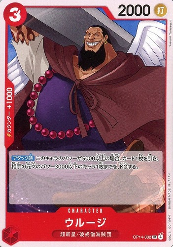 - 【アタック時】このキャラのパワーが5000以上の場合、カード1枚を引き、相手の元々のパワー3000以下のキャラ1枚までを、KOする。
