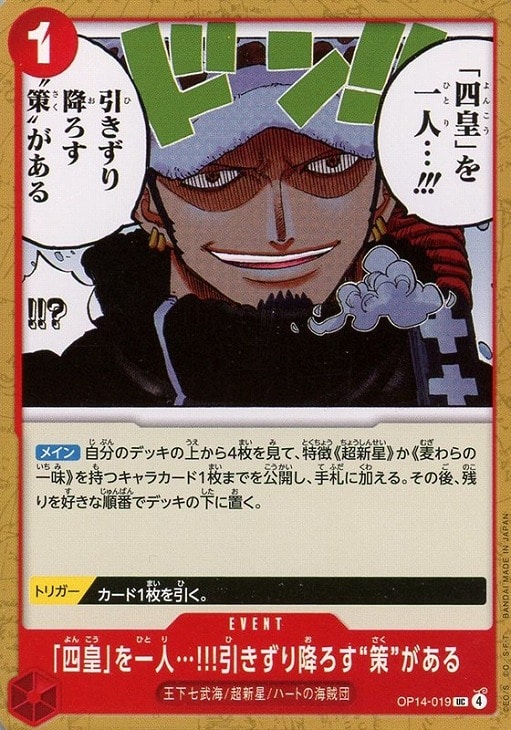 【メイン】自分のデッキの上から4枚を見て、特徴《超新星》か《麦わらの一味》を持つキャラカード1枚までを公開し、手札に加える。その後、残りを好きな順番でデッキの下に置く。