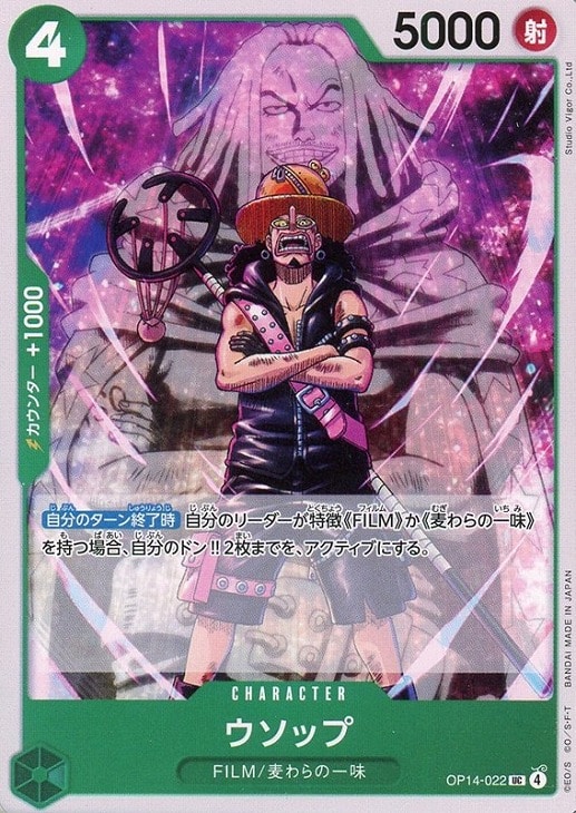 - 【自分のターン終了時】自分のリーダーが特徴《FILM》か《麦わらの一味》を持つ場合、自分のドン!!2枚までを、アクティブにする。