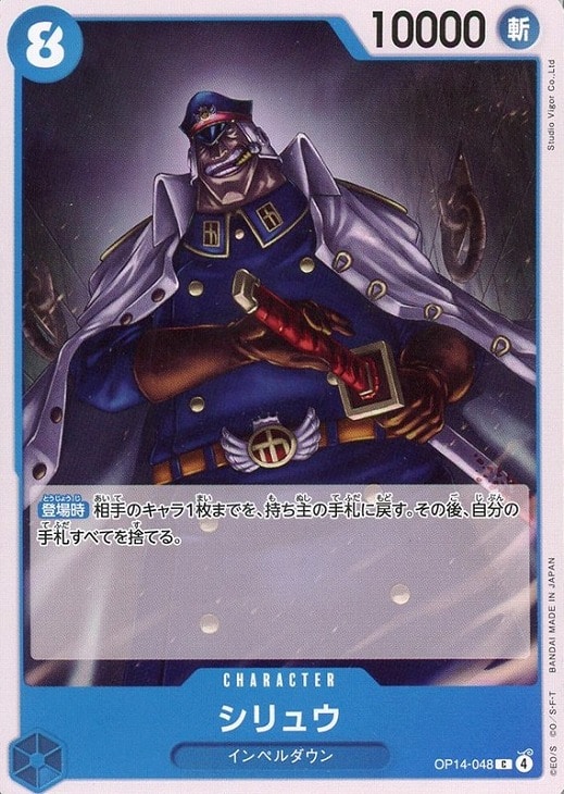 【登場時】相手のキャラ1枚までを、持ち主の手札に戻す。その後、自分の手札すべてを捨てる。